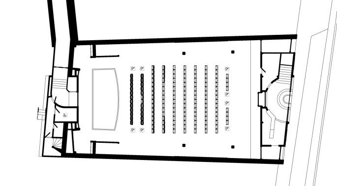 La distance entre la scène et la première rangée de sièges sera augmentée, afin de limiter l’effet de « renversement de tête » lors des projections. Cet espace dégagé permettra par ailleurs d’accueillir des musiciens pour les ciné-concerts.